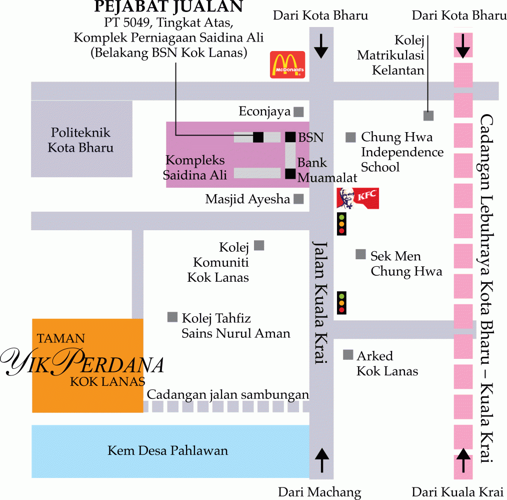 • Lebuhraya Kota Bharu – Kuala Krai (Exit di Jalan Kok Lanas - Selising 2.5km daripada Taman Yik Perdana)